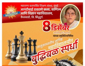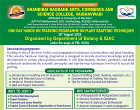 Departmental Activities of Arts - Marathi: Celebration of Anandibai Smruti chashak Competition on the occassion of Hon. Shrimati Anandibai Raorane Smritidin 2025 One day workshop on "Statistical data analysis using MS-Excel financial insights in cooperative societies and bank" Zoology One day Industrial Training Program 2025 Vachan Prerana Din 2025 One Day Hands-On Training Program On Plant Grafting Techniques 2025 Celebration of Har Ghar Tiranga Program 79th Celebration of Independence Day 2025 Celebration of Birth Anniversary of Dr. S. R. Ranganathan and Book Exhibition on 13th August 2025 Major Kaustubh Raorane 7th Smrutidin Event Paithane sir News Apatti Vyavsthapan Celebration of Annabhau Sathe Jayanti and Lokmanya Tilak Punyatithi World Population Day Tree Plantation Siddhivinayak Book Distribution Ceremony Chatrapati Shahu Maharaj and Maharana Pratapsinh Jayanti Celebration 26th June 2025 International Yoga Day on 21st June 2025 One week training Program on Plant Propagation Technique NCC News media Police Training program Gold medal in athletics Oct-2024 NSS Special Residential Camp News NSS Special Residential Camp News 7 days NSS Special Residential Camp 2025 NCC Workshop on Informative workshop on Rifle, Pistol and bullets and their use for protection 2025 Anandibai Raorane Smruti Chashak Badminton Competition 2024 One day study excursion tour to Shital nursery, Talere 2022-23 Self-motivation, Competency and Learning strategy 2022-23 One day study excursion tour 2021-22 Indoor plant propagation techniques 2021-22 Birth Anniversary of Shri Vinodji Tavade Saheb- Poster Exhibition Celebration of National Statistics Day 2023-24 Celebration of National Statistics Day Poster Exhibition on statistical Tools Guest Lecture of Asst. Prof. D. M. Kshirsagar, Lanja College, Lanja Guest Lecture of Alumni Miss. Yogita Kudalkar (M.Sc.) Birth Anniversary of Shri Vinodji Tavade Saheb- Poster Exhibition Celebration of National Statistics Day 2022-23 Poster Exhibition on R-Software National Mathematics Day - S. Ramanujan birth anniversary National Level One Day Workshop on “Group Theory and its Applications’’ Poster Presentation Competition National Science Day celebration - Dr. A. R. Dighe Guiding students Wildlife week celebration, A talk on Wildlife conservation by Dr. M.N. Jambale Lecture on Career Guidance in Zoology Fire Prevention Week International cancer Day Guest Lecture World Wildlife Day, Animal Photography Competition Lab Practicals Guest Lecture Educational Visit External Activities Grafting Management Training Informative Lecture Morally and Financially Supported to the "Dashavtar Folk Art" Womens Day Celebrated Lalit Kala Workshop Marathi Language Day - Poster Presentation Bhashik Lekhan - Praman Patra Course Lekhak aplya Bhetila
